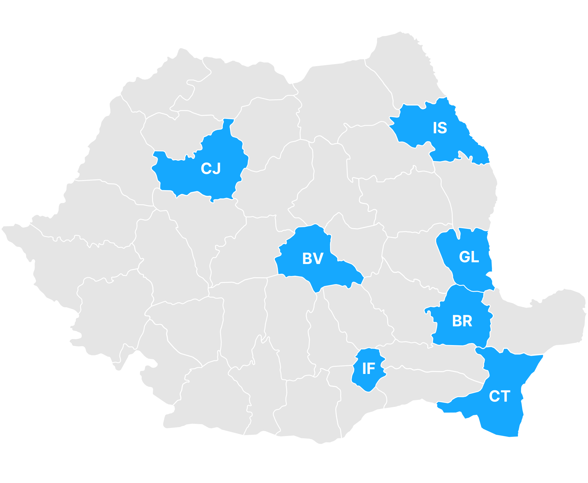 Harta de alături ilustrează acoperirea noastră națională — fiecare marcaj reflectă o zonă în care aportăm profesionalism, promptitudine și respect în furnizarea de servicii de curățenie și facility management.